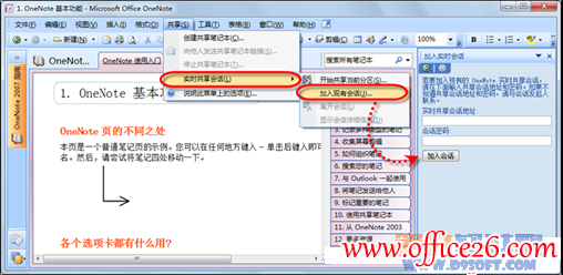 (6)在“实时共享会话地址”和“会话密码”文本框中输入会话地址和密码,然后单击【加入会话】按钮即可加入会话,本次会话的发起者也会在“参与者”列表框中看到所有成员。这样就可以共同编辑同一个笔记页了,如图5所示。