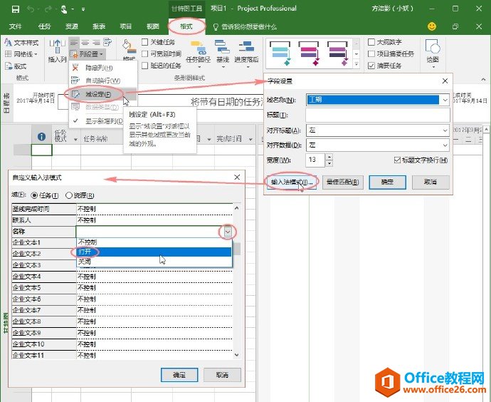 好办啊,只要按下图操作一下下就行了:【甘特图工具格式】》【列】》【列设置】》【域设定】》【输入法模式】》选取指定字段》【打开】