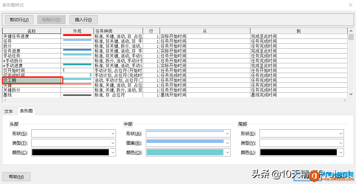 打开【条形图样式】窗口后,在名称中找到【仅工期】,如下图所示,按Delete键或者点击下图中的【剪切行】,都可以让这个条形图样式删除。