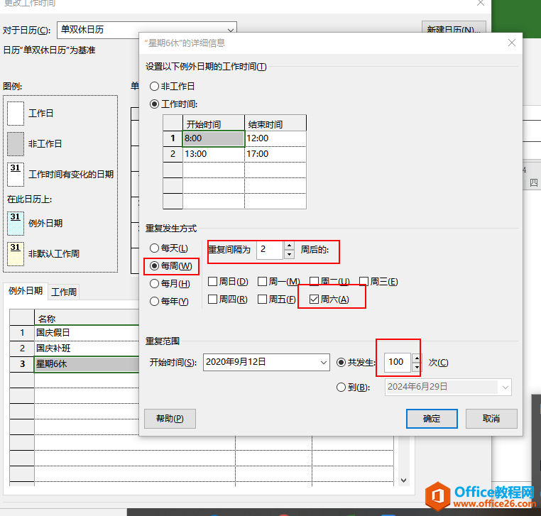 例外日期->工作时间->重复发生每14天发生一次(两周一次单休),重复100次足够使用