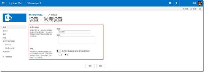在文档库的常规设置里,可以修改名称和说明,是否显示在快速导航(也就是左侧导航,显示的前提是快速导航先得设置显示,如果快速导航没有设置显示,这个选项没有意义);