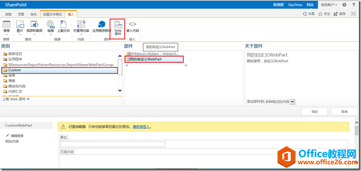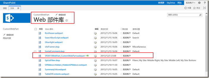 项目文件里CustomWebPart.webpart部署在网站设置,Web部件库,如下图: