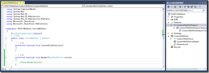 如上图,右侧目录包括:一个Feature文件,WebPart文件,强名称;左侧包括,一个创建控件方法,一个输出方法。