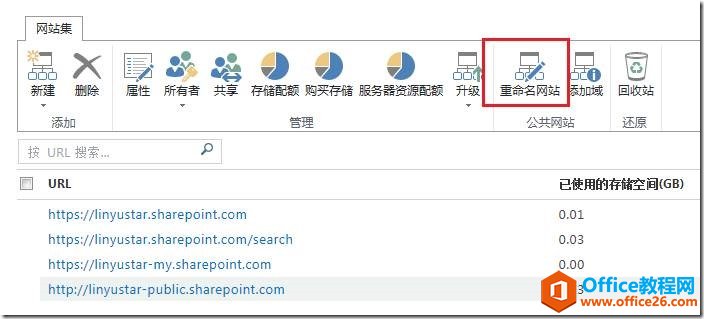 28、进入SharePoint Online管理中心,网站集,选中我们的公共站点,点击菜单栏的“重命名网站”,如下图: