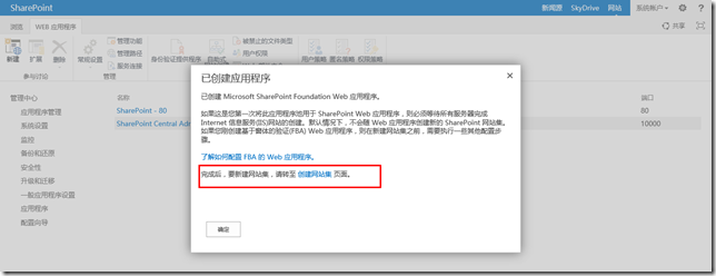 六、其他地方均不需要修改,特别需要也可以自行修改,点击确定即可;创建完毕,如下图,可点击创建网站集,直接创建;