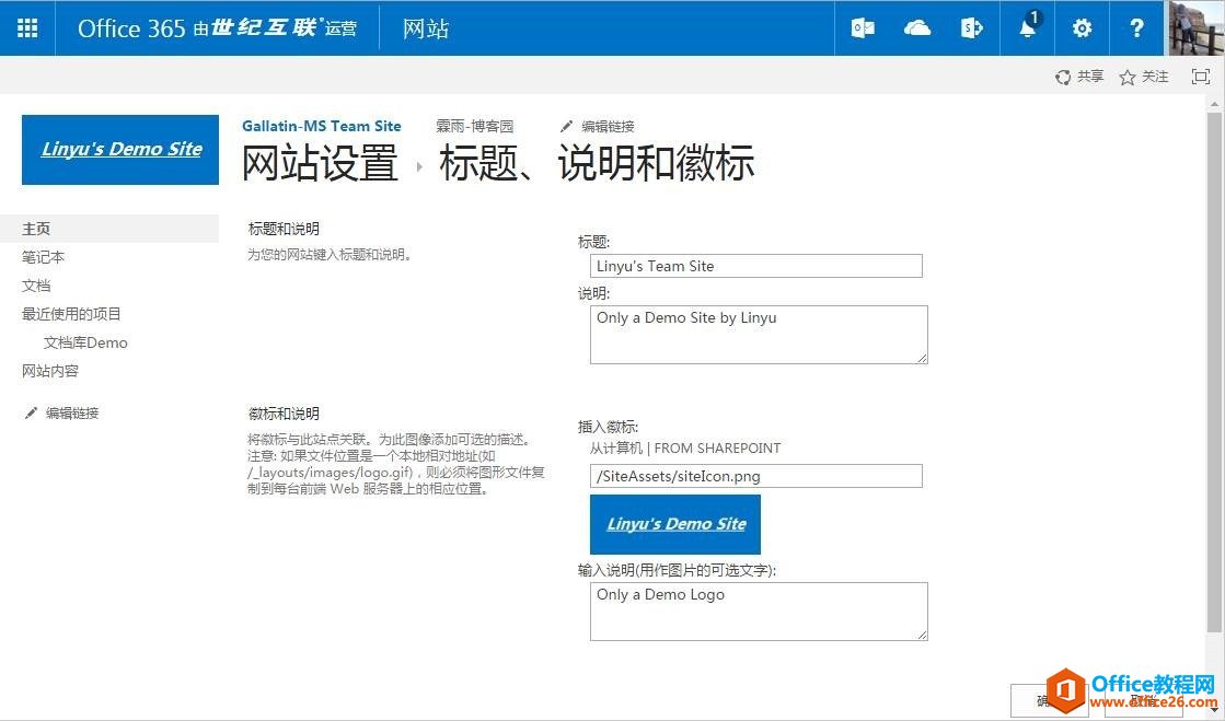 13、回到我们站点的首页,可以看到站点图标、左侧导航、顶部导航都已经修改了,而且,我们也能看到步骤10中添加标题和添加链接的区别;