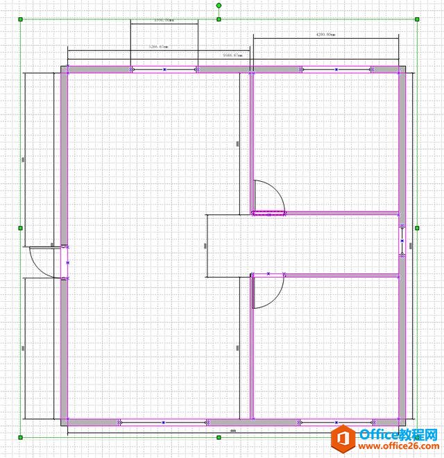 7.添加屋内的墙。直接拖动形状栏中的墙到画布上。按照前面添加外墙、尺寸线和门的方法,按照实际的尺寸和布局画完房屋结构布局。