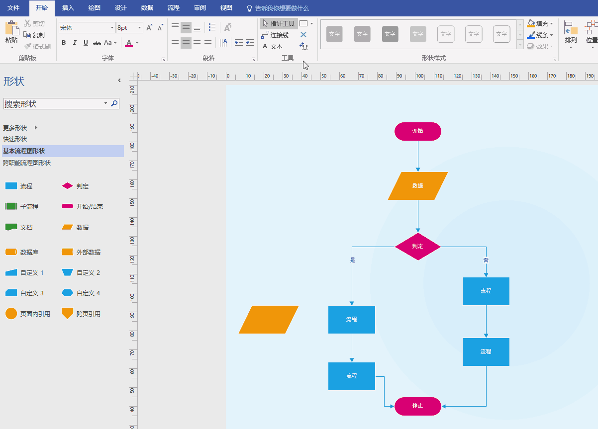 打开模板时,“基本流程图形状”模具也将在左侧打开。模具上每个形状表示过程中的一个不同步骤。大多数流程图倾向于仅使用三到四个形状,除非具有明确的业务用途,才使用更多形状: