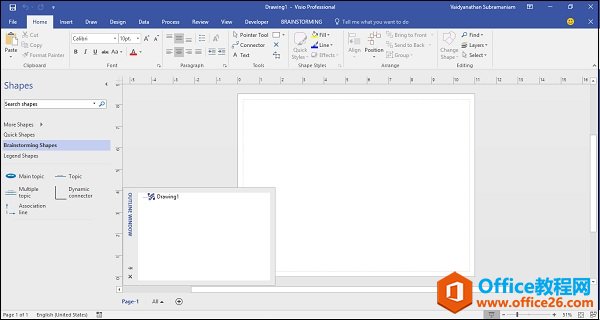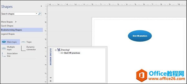 您会注意到头脑风暴图文档已创建并可供使用。与组织结构图相比,这有一些显着的差异。首先,形状的数量小于组织结构图。其次,图中出现了一个轮廓窗口,显示了图表的轮廓。第三,在功能区中添加了一个头脑风暴选项卡,其中包含使用头脑风暴图所需的工具。