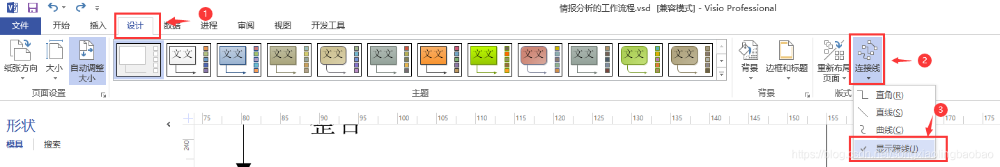 方法: 【设计】->【连接线】->【显示跨线】,如果【显示跨线】前面的√存在,则会显示跨线,就和文章开始显示的问题相同,只需要点击一下,把这个√去掉,跨线就不会显示了。