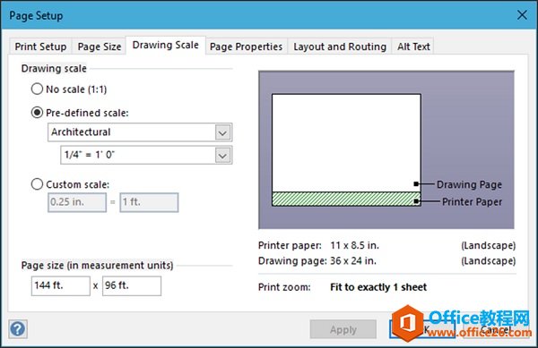在“页面设置”对话框中,单击“绘图比例”选项卡以设置定义的比例。您可以使用预定义的比例或输入自定义值。您可以将页面大小(以度量单位)字段设置为适当的页面大小。
