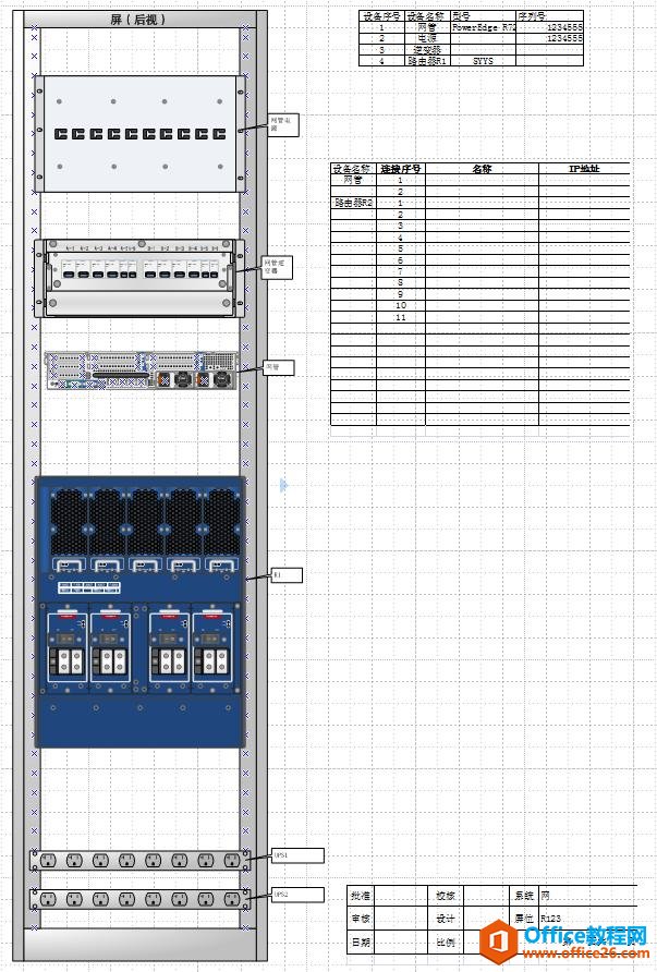 可以利用Visio的电子图形制作。制作出每个屏的正视图和后视图。特点是与实际服务器、交换机等设备的正视后视面板相同,按照实物大小进行等比例缩放,打印出的图直观,并且对于作图者上手快,易于入门。
