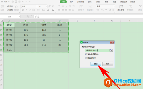 首先,我们选中表格,按住快捷键Ctrl+T,弹出创建表,单击确定。