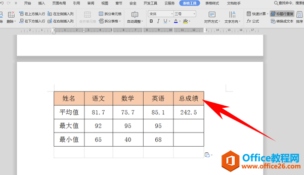 在这里,我们单击工具栏表格工具下的标题行重复。