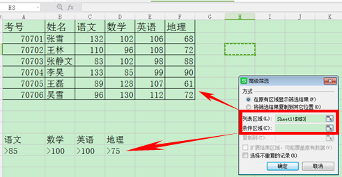 是不是很简单呢,当然普通筛选会简单一些,但如果我们要给表格数据设置一组条件,这个条件就是你想要在表格中看到的信息,这就需要我们运用WPS表格里的高级筛选,如成绩表中,我们给数据设立了语数外地理的条件: