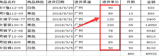 然后,第一个进货单价出来了以后,把光标移至单元格右下角,等光标变成+字标记的时候,向下拖动鼠标,相应的进货单价就出来了,其它的数据也会跟着变化。如下图: