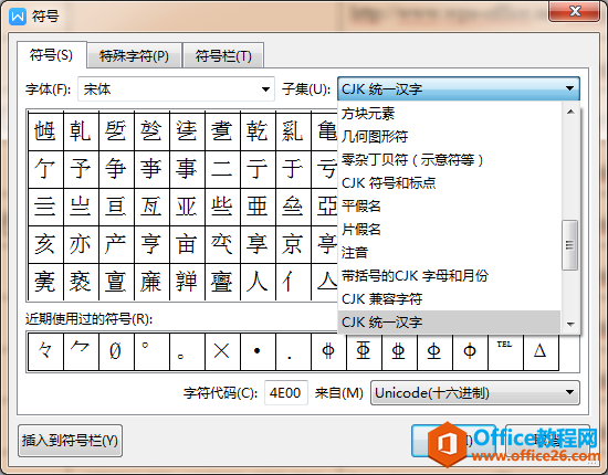 第二步:在『符号』对话框的『字符(F)』下拉框中选择『宋体』, 『子集(U)』下拉框中选择『CJK 统一汉子』;
