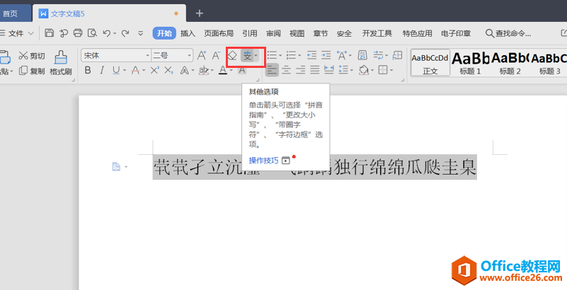 选取文档内所有的生僻字,在上方【开始】的功能栏中找到【拼音】也就是文字上方有个拼音标注的选项: