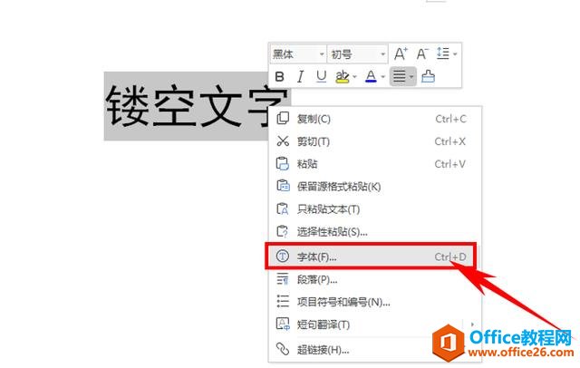 Word 中如何设置镂空字体,首先选中字体,鼠标右键点击——字体: