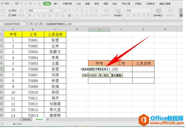 我们在序号当中输入随机函数公式=RANDBETWEEN(1,20),单击回车。