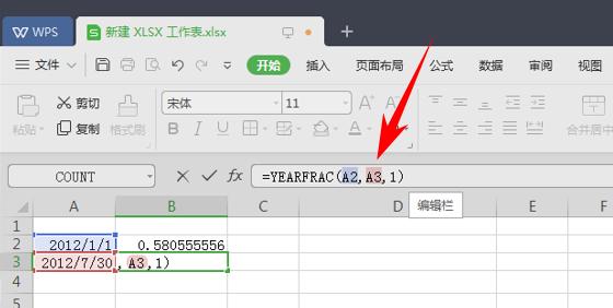 输入完成后单击B2单元格,在输入栏中输入“=YEARFRAC(A2,A3)”(缺少基准参数)