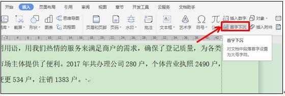 首先,我们从这张图中可以看到,一个地字占用了二行的位置,而且字体和其它的字体不同。所以我们在设计的时候一定要考虑到这些因素,打开Word文档或者WPS文档之后,我们选中这一行的第一个字,点击插入菜单栏,在工具栏中找到首字下沉的工具,如下图: