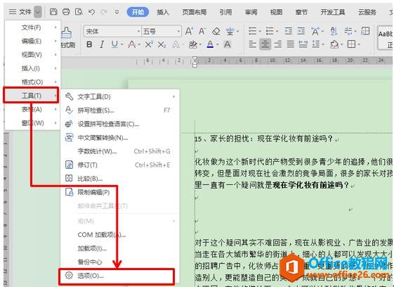 里面的回车标记特别的多,而且非常的乱,这个时候,我们选择最左边的文件菜单,在下拉菜单中选择工具下面的最后一个选项,如图: