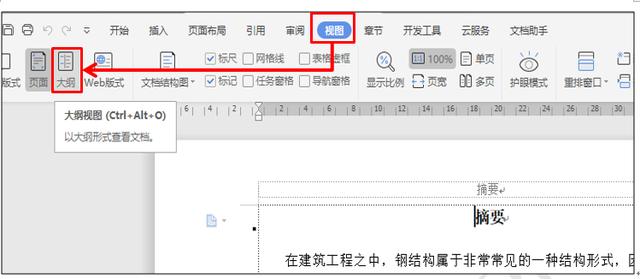 现在如果我们想把它改为大纲页面显示的话,首先,我们点击视图下面的大纲工具选项,如图2