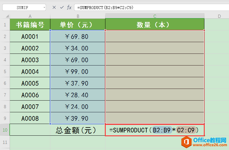 公式“=SUMPRODUCT(B2:B9*C2:C9)”意为B2到B9单元格中的单价分别与C2到C9单元格中的数量相乘,再将所有乘积相加求和。