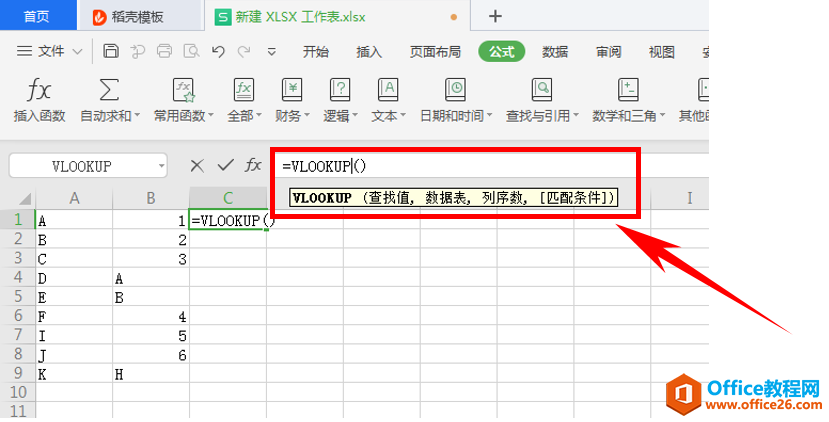 在上面的数据中,我们想找到A列和B列中都有的数据。可以使用excel中的VLOOKUP函数对这两列数据进行匹配。输入VLOOKUP系统会自动提示用法。这个函数里面有四个参数。分别对应的是要查找值,数据表,列序数,近似还是精确匹配: