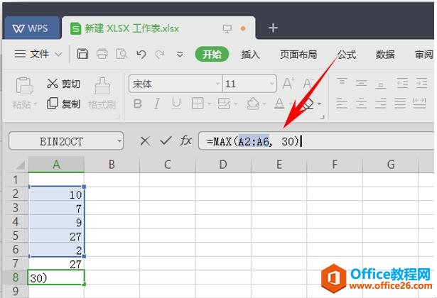 如果我们想求区域A2:A6和数值30之中的最大值,便可在输入栏中输入“=MAX(A2:A6,30)”