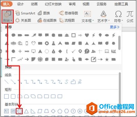 首先,我们先新建一个空的PPT文稿,然后在插入菜单下选择形状下拉选项里的圆形,如图1