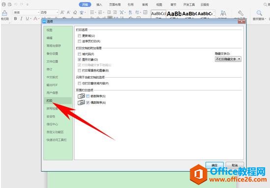 弹出选项的对话框,单击打印选项,找到双面打印选项的位置,我们看到软件默认为偶数排序。