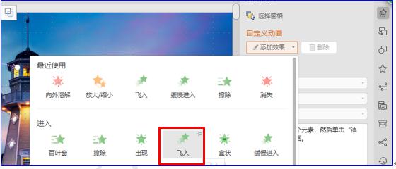 然后点击屏幕右侧的自定义动画按钮,调出自定义动画窗口,点击添加效果,在下拉菜单中选择进入类型为飞入,如图7