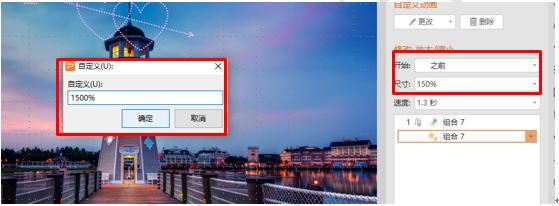 然后再把开始处改为之前,和上一个动画同步,尺寸改为自定义,在对话框内输入1500%,如图11