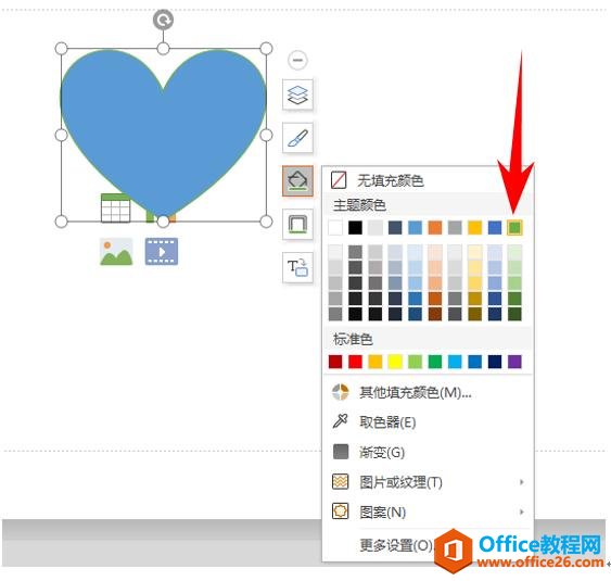 此时,选中心形形状单击鼠标右键复制粘贴,再复制3个同样图形,用鼠标点击旋转图标,旋转图形设置图形方向。