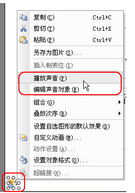 当插入背景音乐后,会在幻灯片左下角出现一个代表背景音乐的声音图标。这时,您可以在这个图标上点击右键,在快捷菜单上选择“播放声音”来检测插入的文件是否可以播放。单击鼠标即可结束播放。见图2: