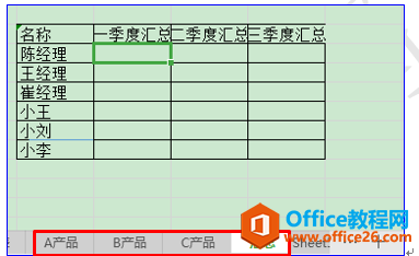 当我们打开一张这样的WPS表格和Excel,里面包括很多的工作表,如图1,我们想要把A,B,C产品合并到一个表格中,我们就可以使用这个方法: