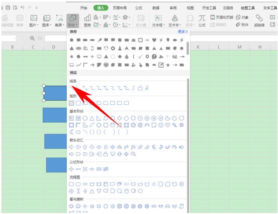 3、点击插入选项,在其工具区里点击形状选项,可以看到箭头汇总的选项。
